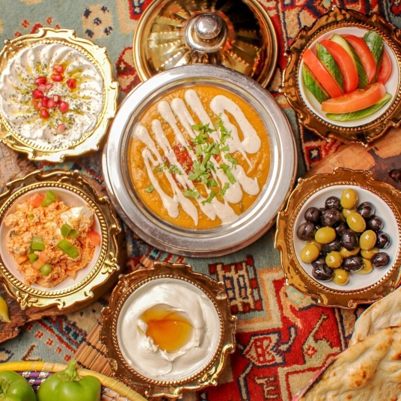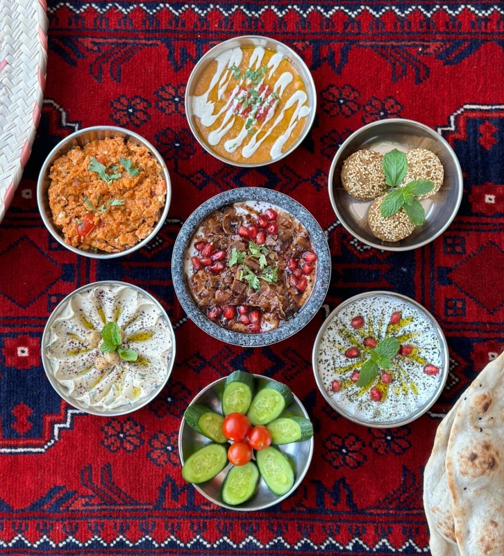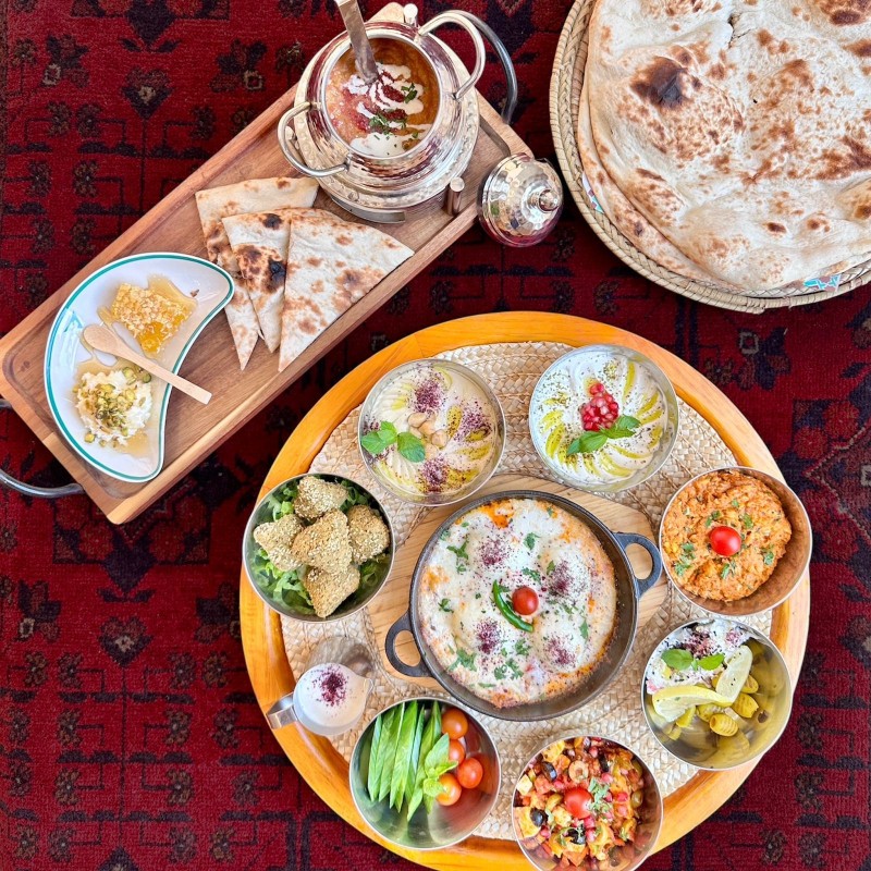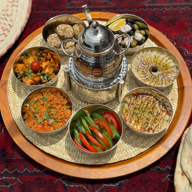 تشكيلة من : كبده وشكشوكة وفول وحمسة حلوم باذنجان وحمص بيروتي ولبنه زعتر وحلاوة طحينية بالقشطة والمكسرات وخيار طماطم