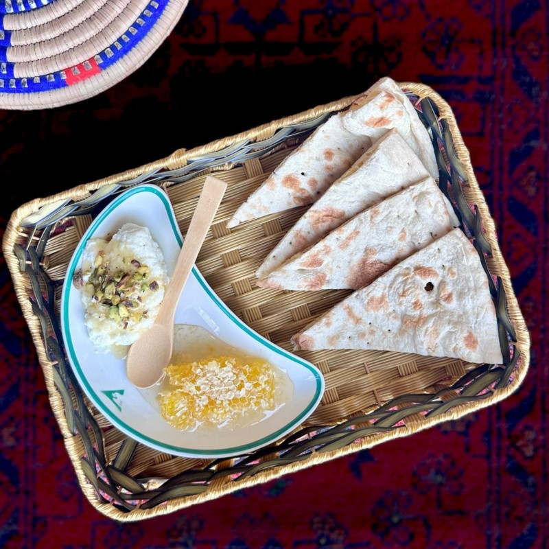(340 سعرة حرارية)طبق رئيسي من اختيارك فول أو شكشوكة بالاضافة إلى تشكيلة من عسل ، زيتون ، سلطة جبن ، لبنة ، طماطم وخيار