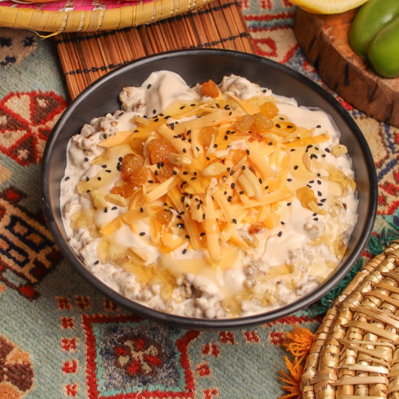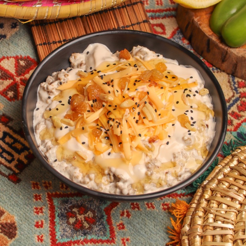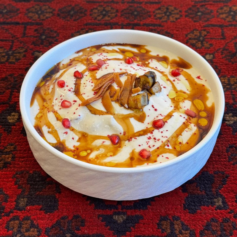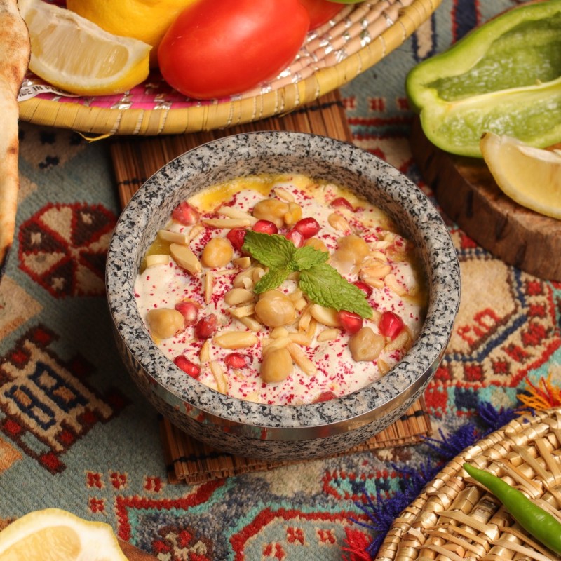 (480 سعرة حرارية)الحمص المسلوق والمثوم مغطى بطبقة الخبز المحمص واو المقلي ويضاف فوقه لبن الزبادي المملح