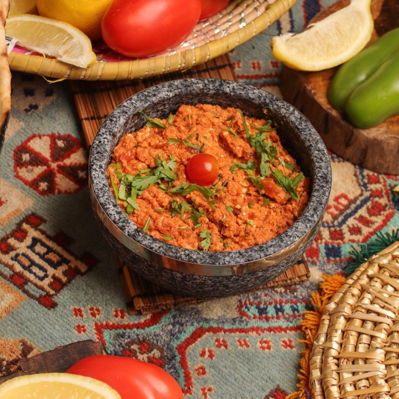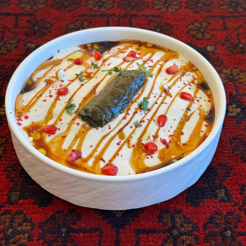 (257 سعرة حرارية)الطبق اللذيذ من ورق العنب و الخبز المحمص، بخلطة الطحينة المميزة ومزيج بحبات الرمان الطازجة ودبس الرمان الغني بالنكهه