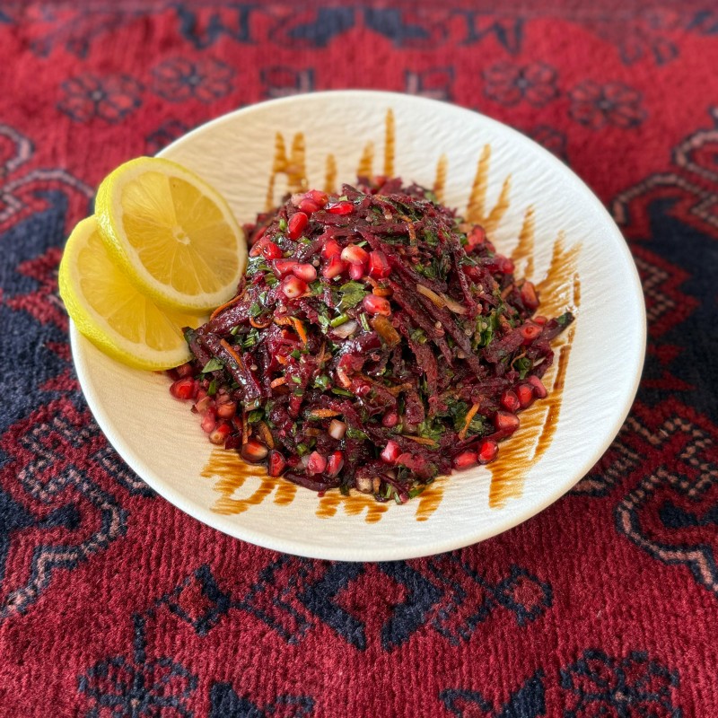 (97 سعرة حرارية)سلطة الشمندر تتكون من البنجر والبقدونس والرمان وصوص الفريج الخاص