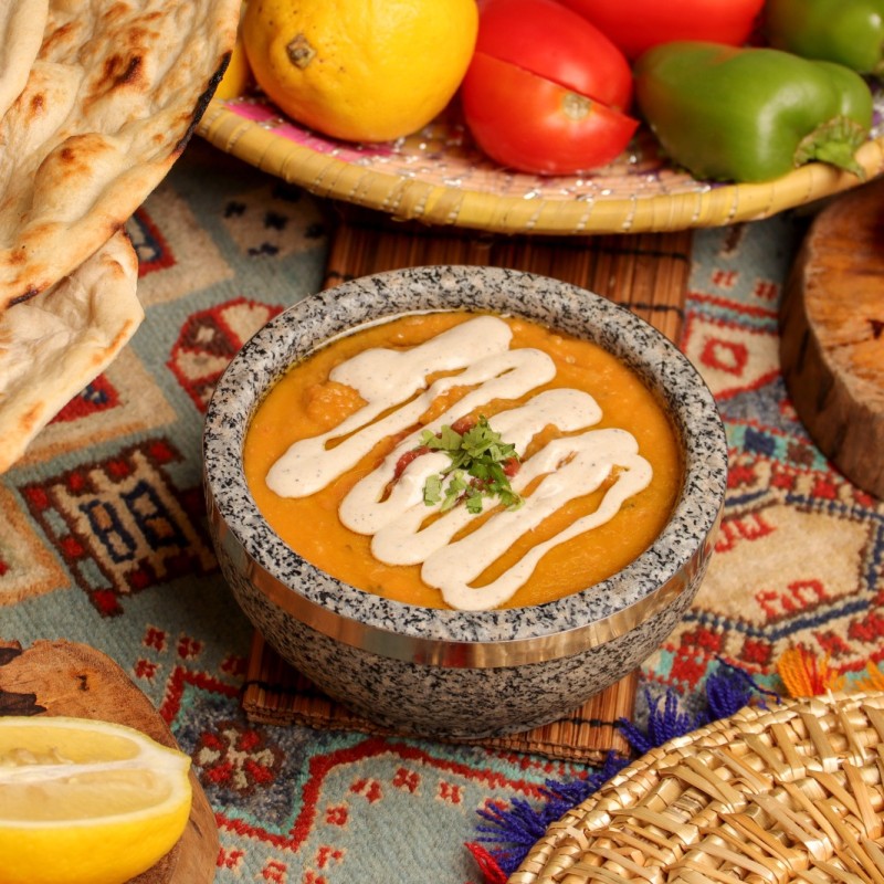 (305 سعرة حرارية)فول الفريج الخاص مع صلصة وبهارات الفريج المميزة . طبق خارجي الطحينية السائلة وزيت الزيتون