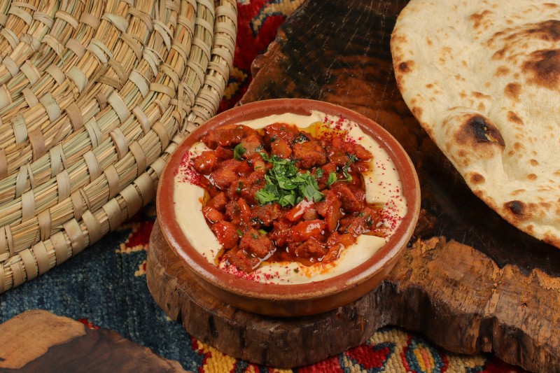 (360 سعرة حرارية)كبدة طازجة يومياً مع البصل والطماطم وبهارات الفريج المميزة وتحتها الحمص الشامي اللذيذ