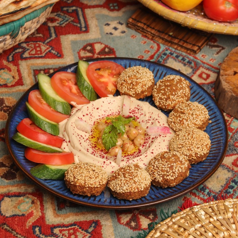(650 سعرة حرارية)طبق الفلافل اللذيذة مع الحمص وخيار وطماطم وزيت زيتون