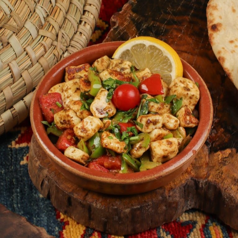 (510 سعرة حرارية)حمسة الجبن الحلوم بالباذنجان اللذيذة مع مزيج من طماطم الشيري والفلفل الاخضر البارد وصوص مقلط الفريج الخاص