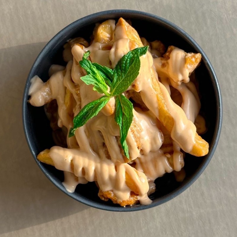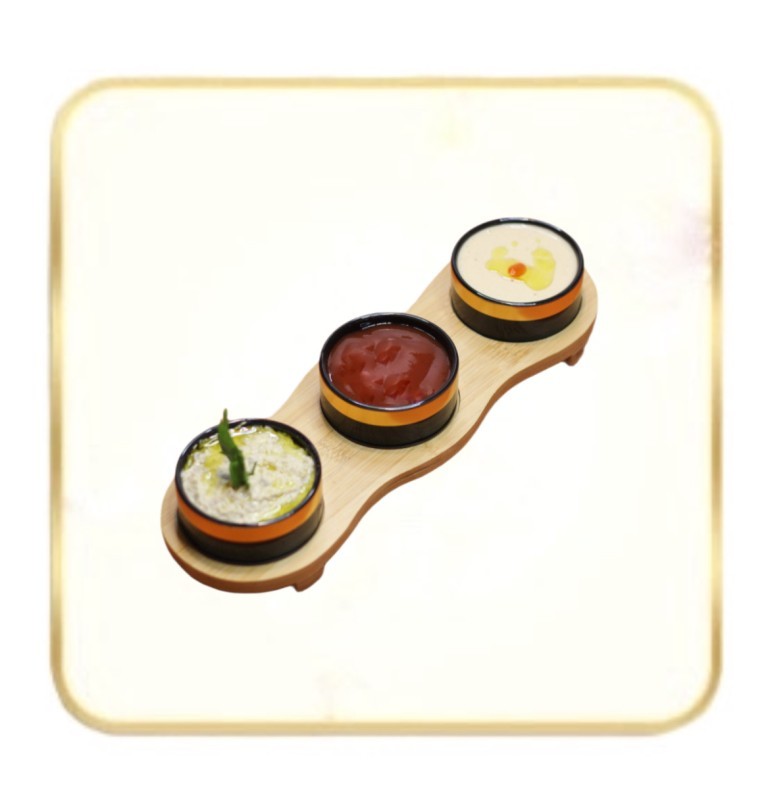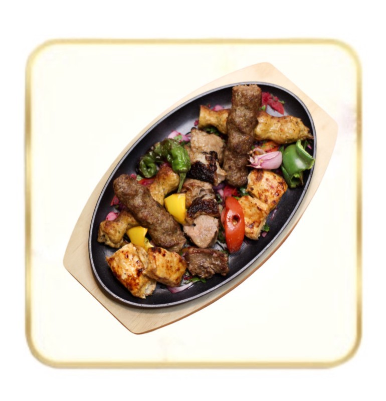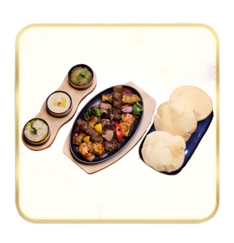 طبق يجمع ٣ أنواع من المشويات مع 3 أنواع من المقبلات (يشمل الطبق الخبز والبطاطس)