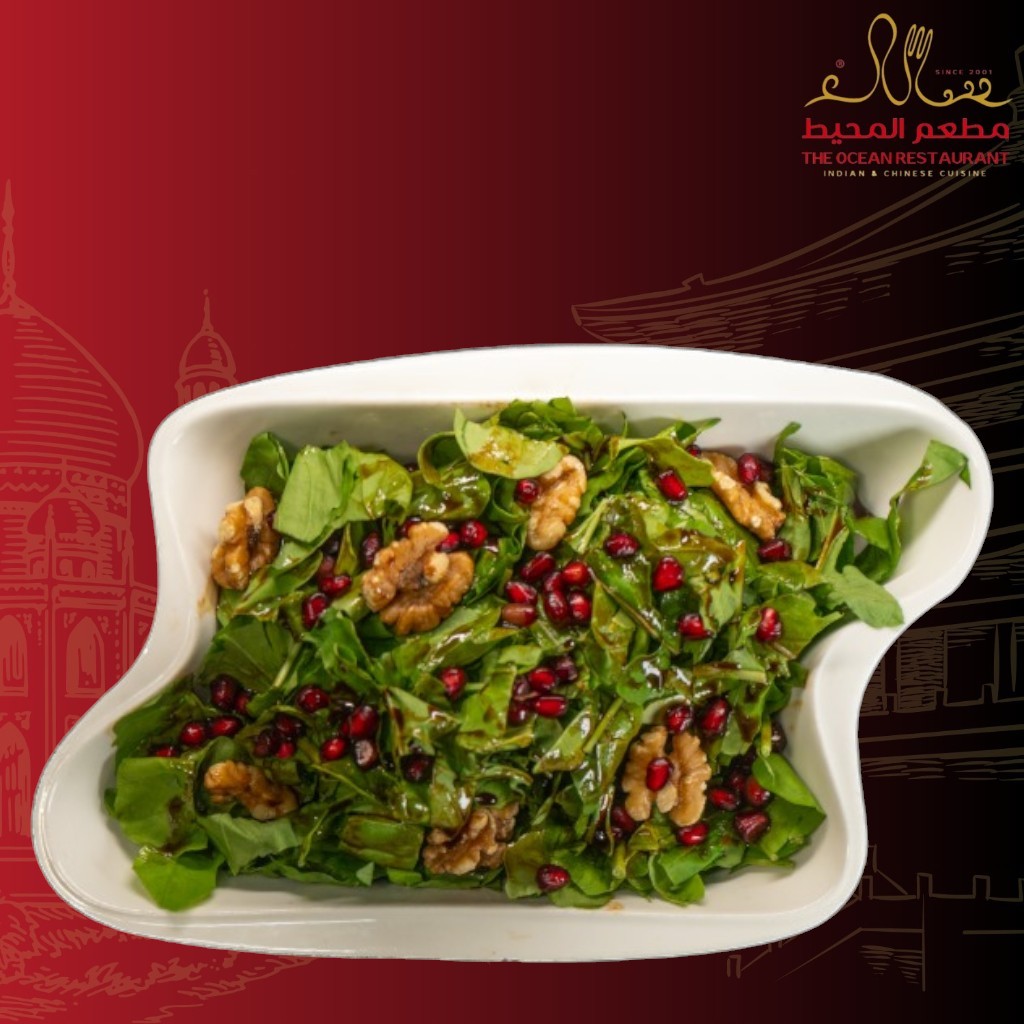 (261 Calories)Jarjeer Salad is a traditional Middle Easter salad made with Arugula Leaves, Pomegranate seeds, molasses, walnuts, Red Onion, and Tomato lightly seasoned with Olive oil, Lemon juice and sumac