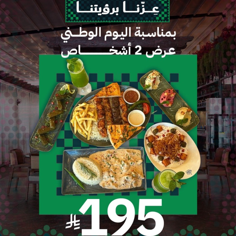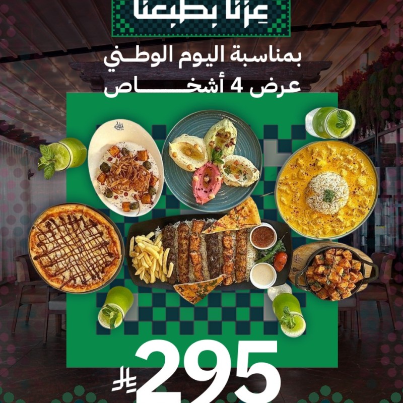 (2345 سعرة حرارية) 587 دقيقة*يشمل العرض -مشاوي 6 اسياخ مع الارز -حمص مشكل -سلطه تبوله او فتوش -بطاطا حاره او بطاطا كزبره بالثوم -صحن دجاج بالكاري والارز -فته باذنجان او فته ورق عنب -بيتزا دجاج -4 ليمون نعناع