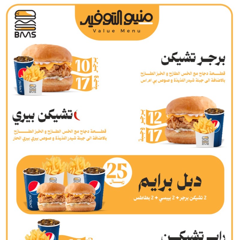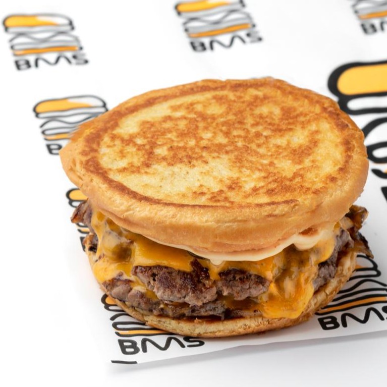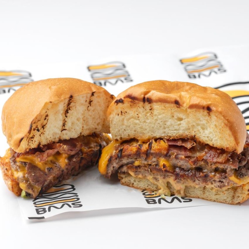 قطعتان من اللحم مشويه ومحضره مع الخس الطازج وخبز البرجر الطازج وجبنة شيدر اللذيذه وصوص بي ام اس المميز