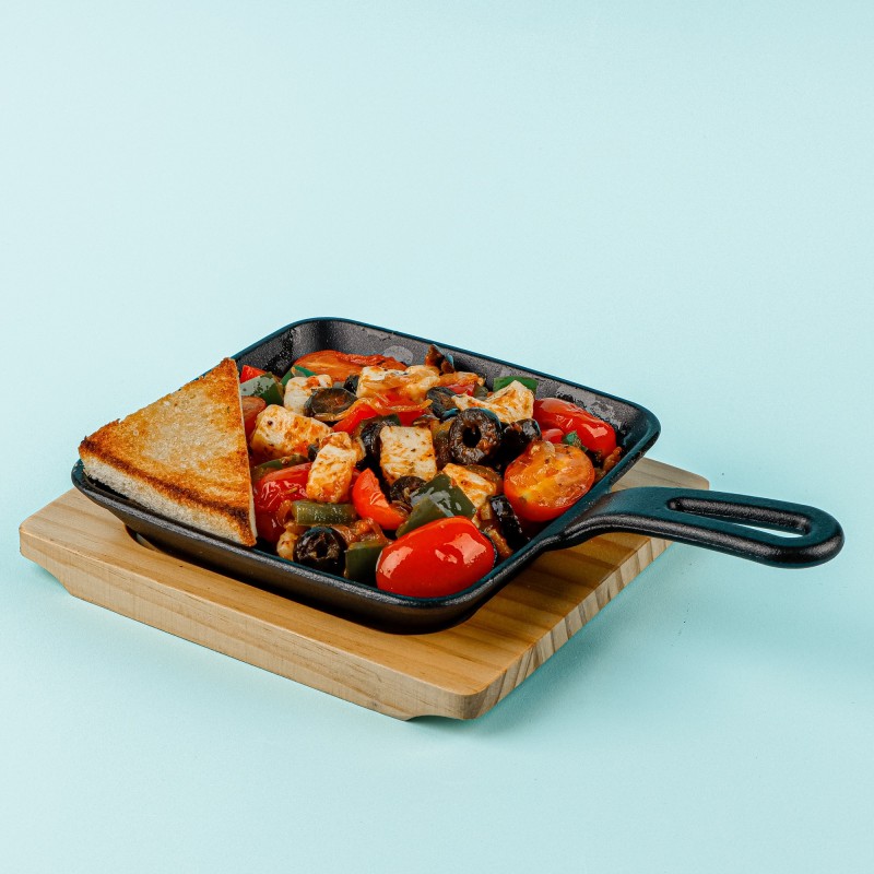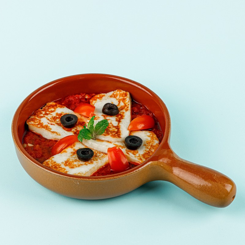 (263 سعرة حرارية)قطع من جبنة الحلوم مع زيتون وطماطم وبعض التوابل ويقدم قطعة خبز محمص