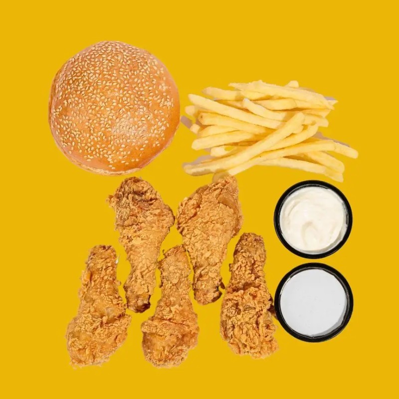 خمسة قطع من أفخاذ الدياي المقرمشة تقدم مع البطاطس المقلية وصوص الطحينية وصوص الثوم