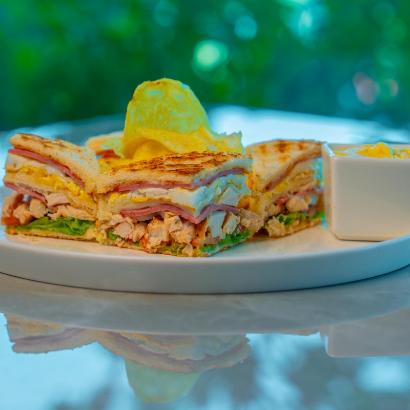 دجاج مشوي، ديك رومي مدخن، بيض مقلي، خس، طماطم، وجبنة محشوة في خبز محمص — يُقدم مع صوص هوني مسترد جانبي