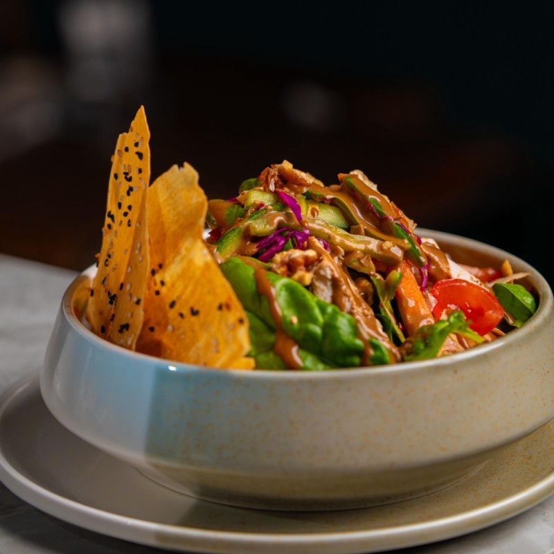 مزيج استوائي من قطع الأناناس المشوي، دجاج ممزق، ملفوف بنفسجي، جزر، وطماطم شيري، على طبقة من الخضار الطازجة، ومزين ببذور السمسم المحمصة وصوص الزنجبيل بالليمون.