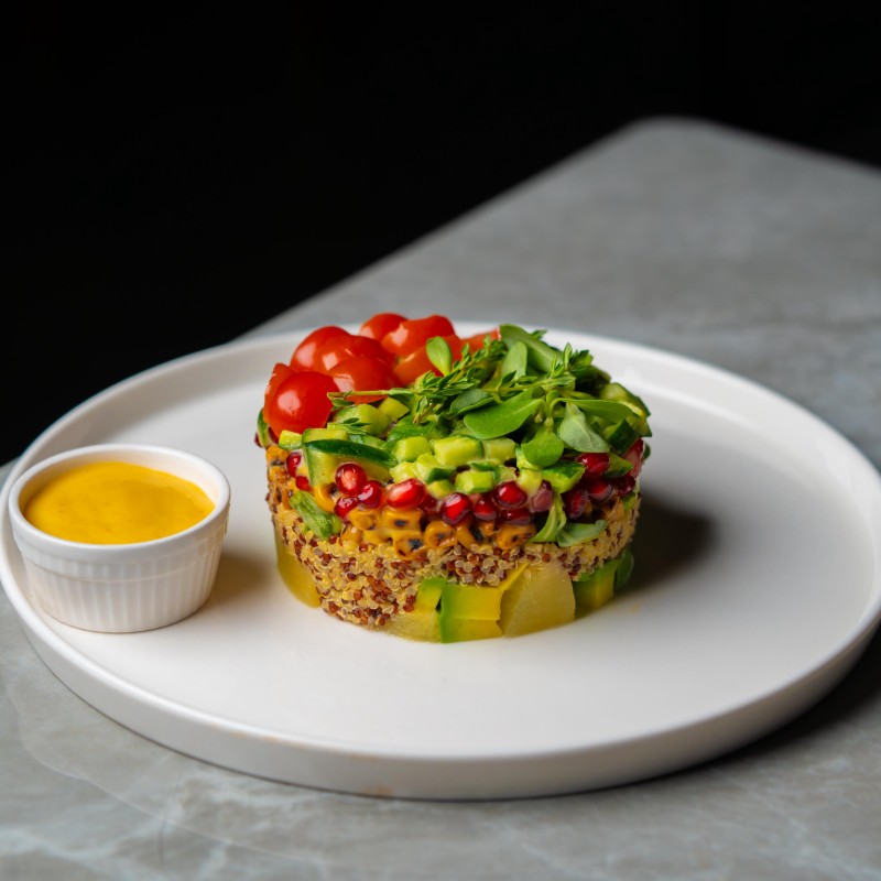 مزيج طازج من الخس، الطماطم، الذرة، الأفوكادو، الفاصوليا السوداء، الكينوا، والجبنة، مع صوص الريمولاد المنعش.