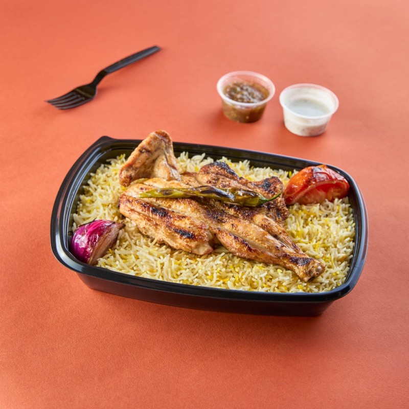 فروج طازج مشوي - اختيارك من البطاطا أو الأرز - ثوم - ثوم سبايسي - صوص الأكابر - مخلل - خبز صاج
