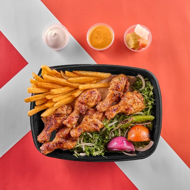 أرجل افخاد الدجاج المتبلة والمشوية علي الفحم مع البطاطس المقلية و صوص الثوم والمخلل و صوص الثوم الحار