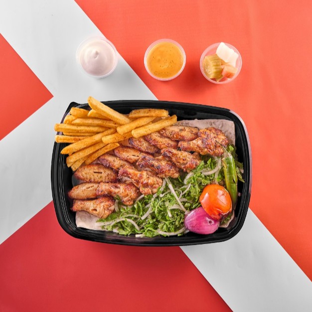 3 اسياخ شيش طاووق طازج مع البطاطا والثوم والخبر الطازج
