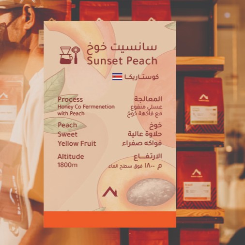 محصول كوستاريكا سانسيت خوخ حلاوة عالية ونكهات خوخ وفواكه صفراء، معالجة عسلية مخمرة بالخوخ، من ارتفاع 1800م… تجربة ناعمة ولذيذة تعكس جمال الغروب في كل رشفة. ☕🍑✨