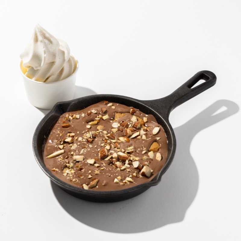 (520 سعرة حرارية)عجينة كوكيز فاخرة مصنوعة من أجود أنواع الزبدة الأوروبية والكاكاو، ومحشّية بأرقى أنواع الدارك شوكلت البلجيكي. تُقدَّم طازجة وساخنة على الصاج، ومعها آيسكريم الفانيلا الطبيعي 100%… مزيج يرفع المزاج .
