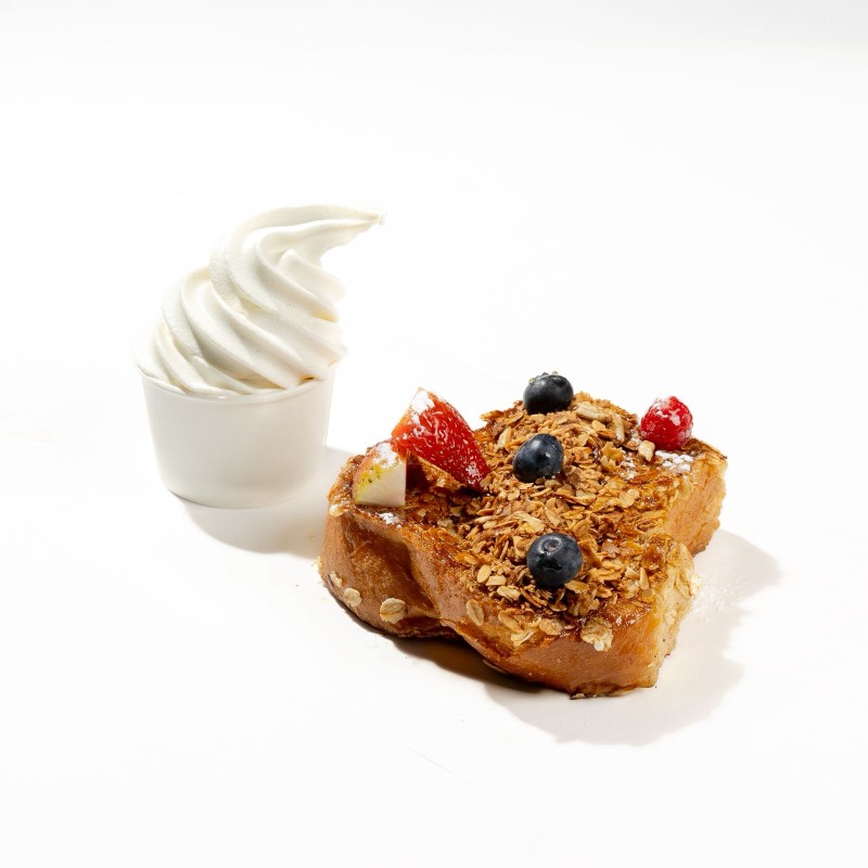 (240 سعرة حرارية)قطعة خبز البريوش الفاخرة المحمصة على الطريقة الفرنسية يقدم مع جرانولا و قطع التوت و الايسكريم.