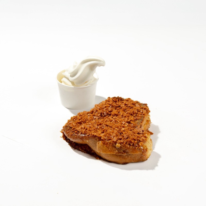 (590 سعرة حرارية)قطعة خبز البريوش الفاخرة المحمصة على الطريقة الفرنسية يقدم مع صوص الفول السوداني وزبدة اللوتس والكراميل والايسكريم.