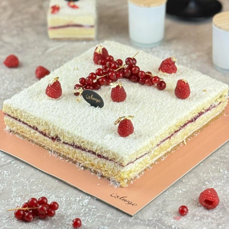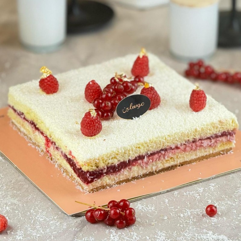 تكفي من خمسة إلى سبعة أشخاص - مزيج شهي من طبقة البسكويت وكيك الفانيلا الإسفنجي، غني بصوص التوت الأحمر ومغطى بطبقة غنية من جوز الهند