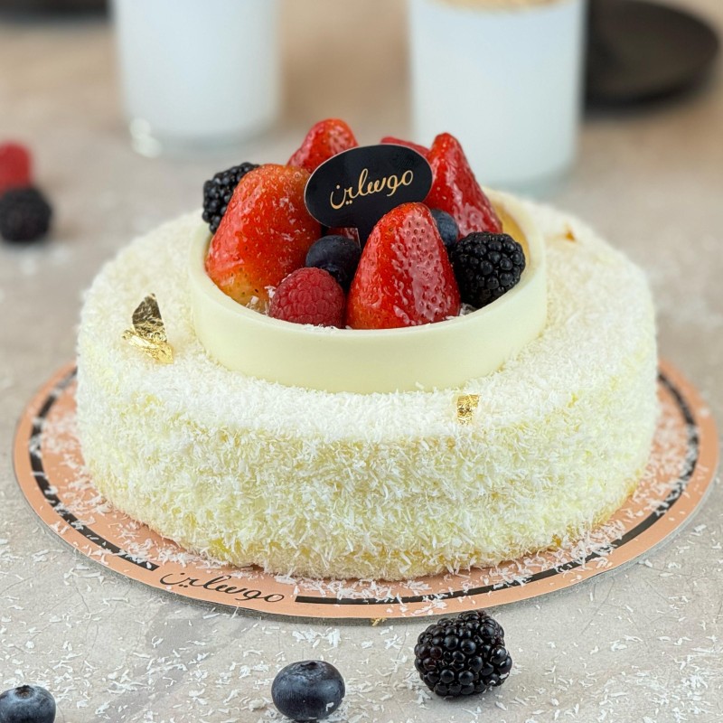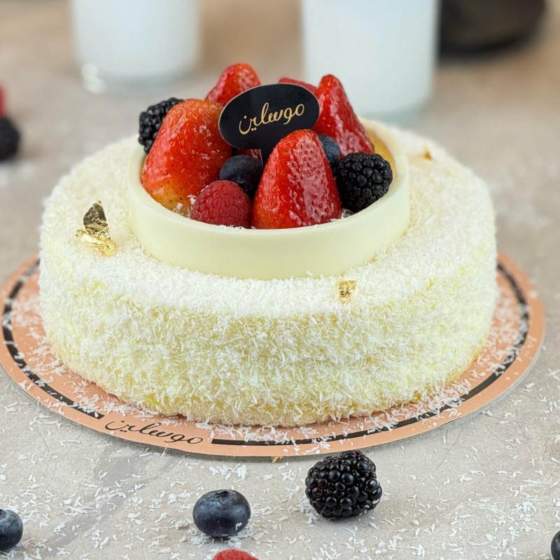 6-8 أشخاص - 22 سم-طبقات من كيك الفانيلا مع كريمة الفشار وهريس التوت الأحمر وجوز الهند مزينة بتوت العليق الطازج والشوكولاتة البيضاء واللوز