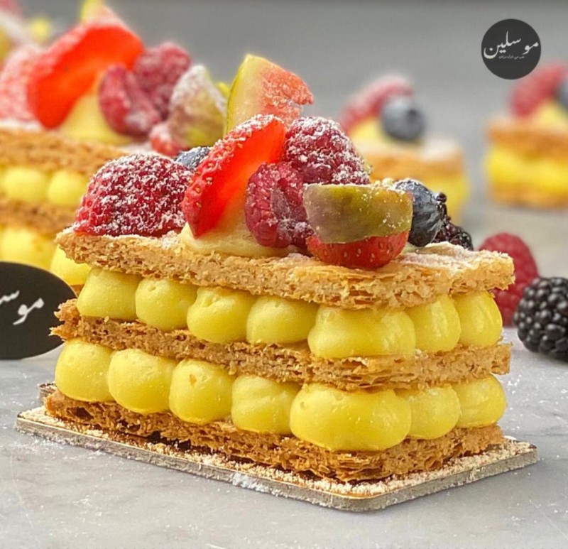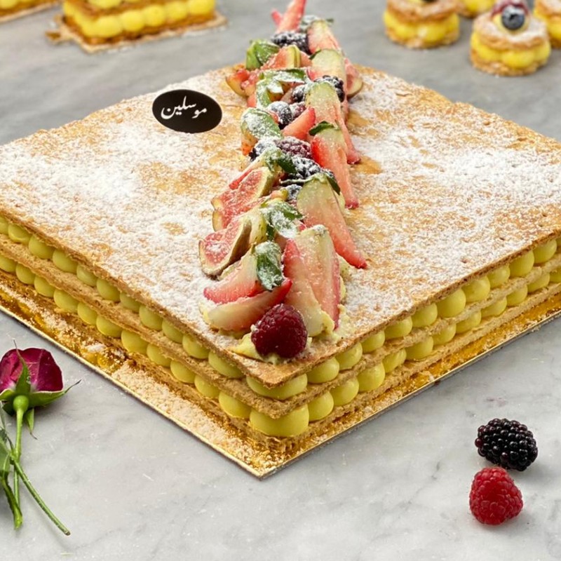6-8 أشخاص - 20 سم-ميلفيه مقرمشة بالكاسترد ومزينة بأنواع من التوت والتين والفراولة الطازجة
