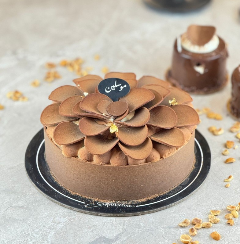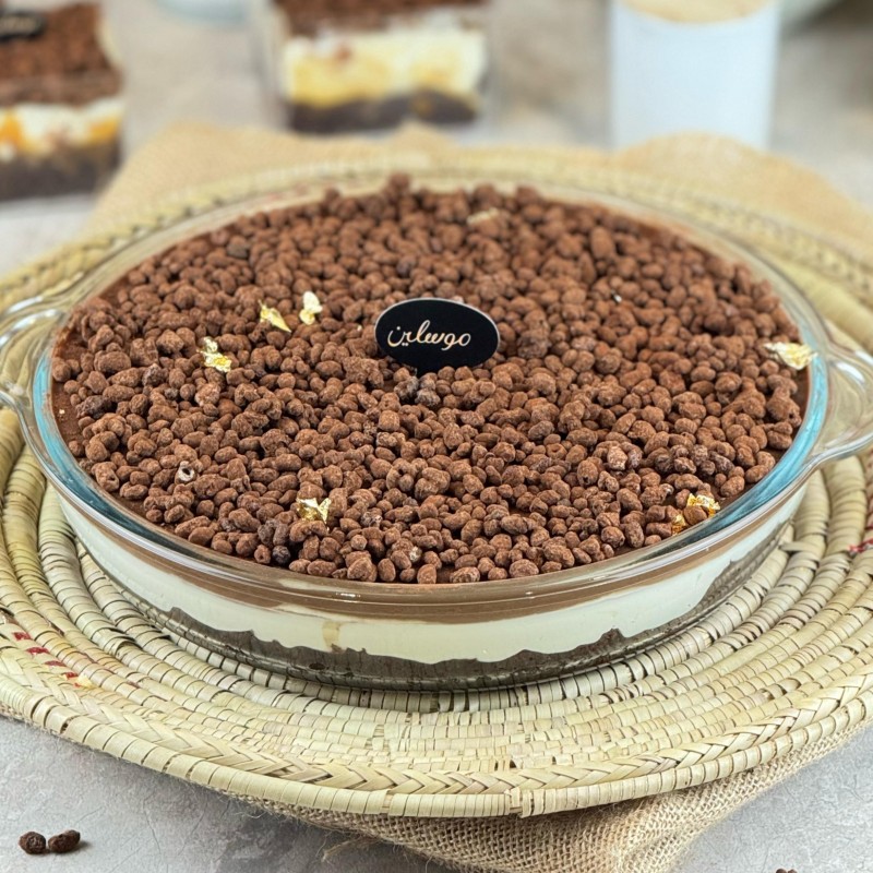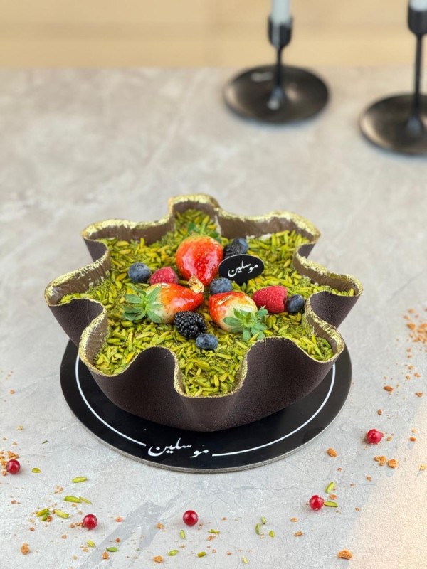 6-8 أشخاص- كيكة غنية بالموس تشوكلت وبسكويت اللوتس بنكهة الفستق والكريم تشيز مغطاة بكريمة الشوكولاتة وشرائح الفستق في قالب توليب شوكليت