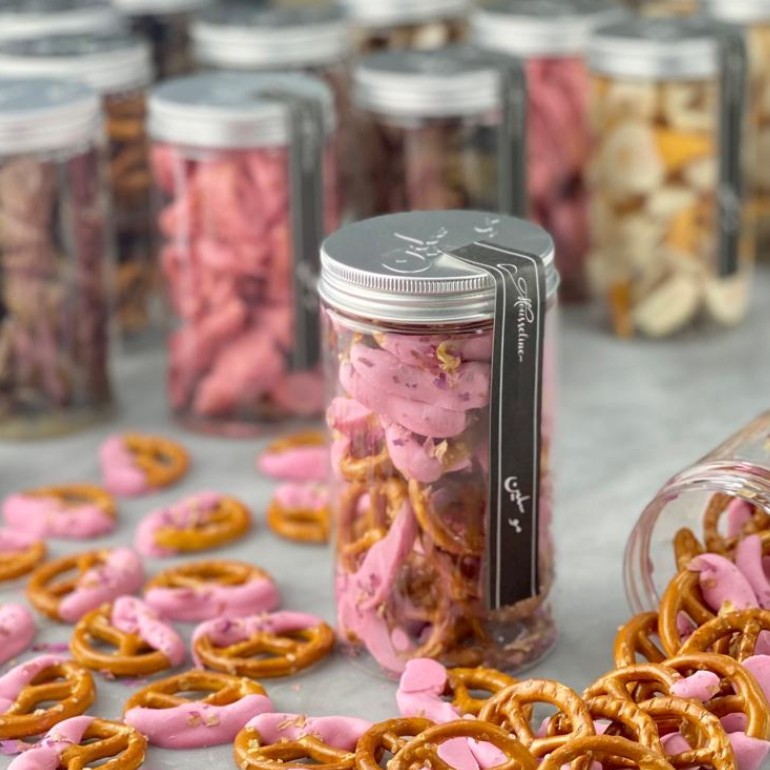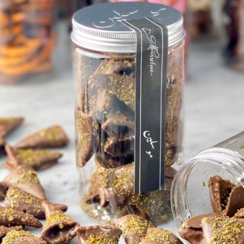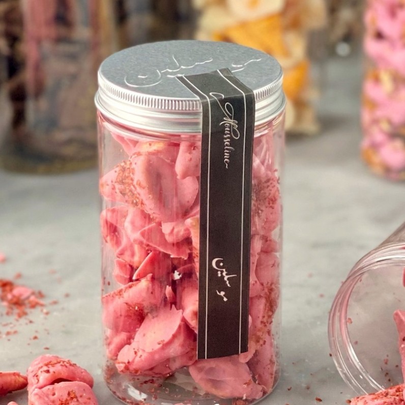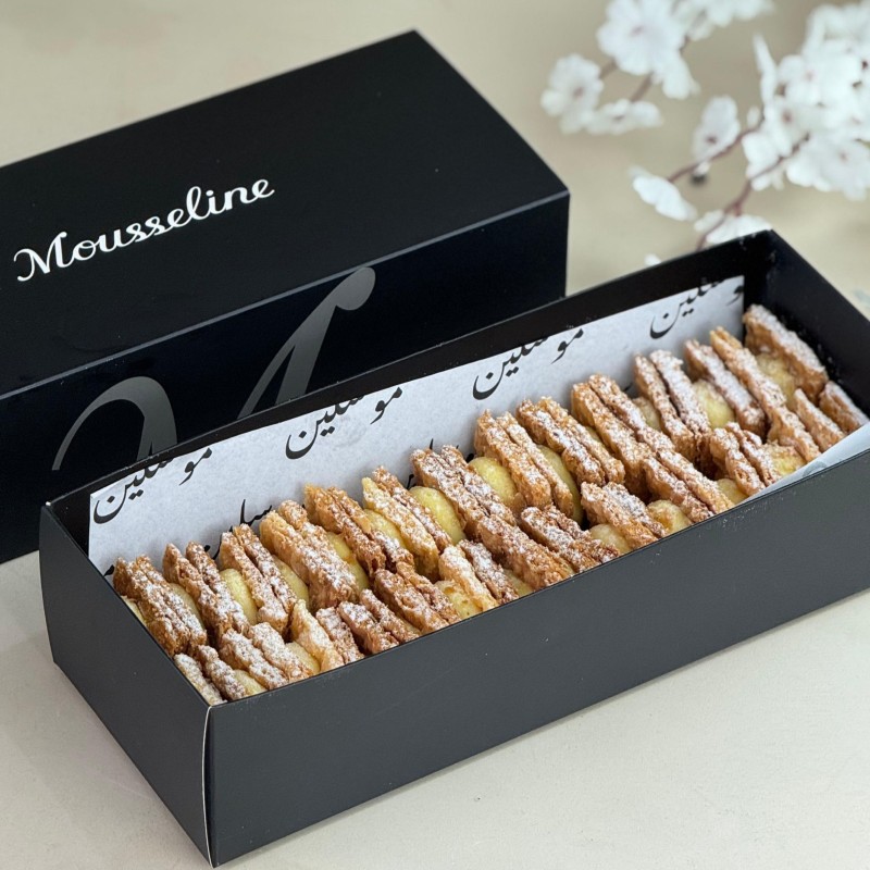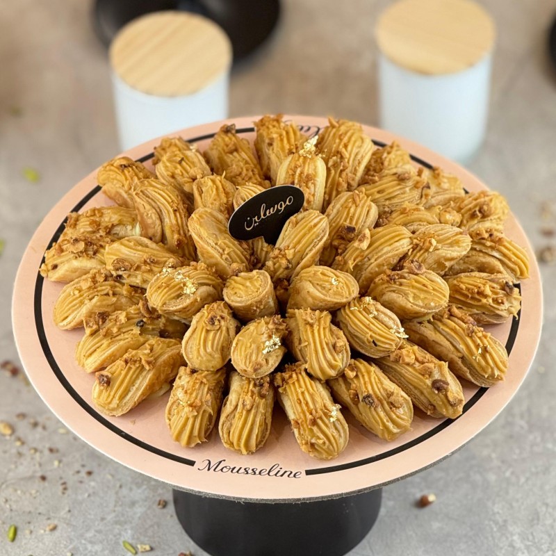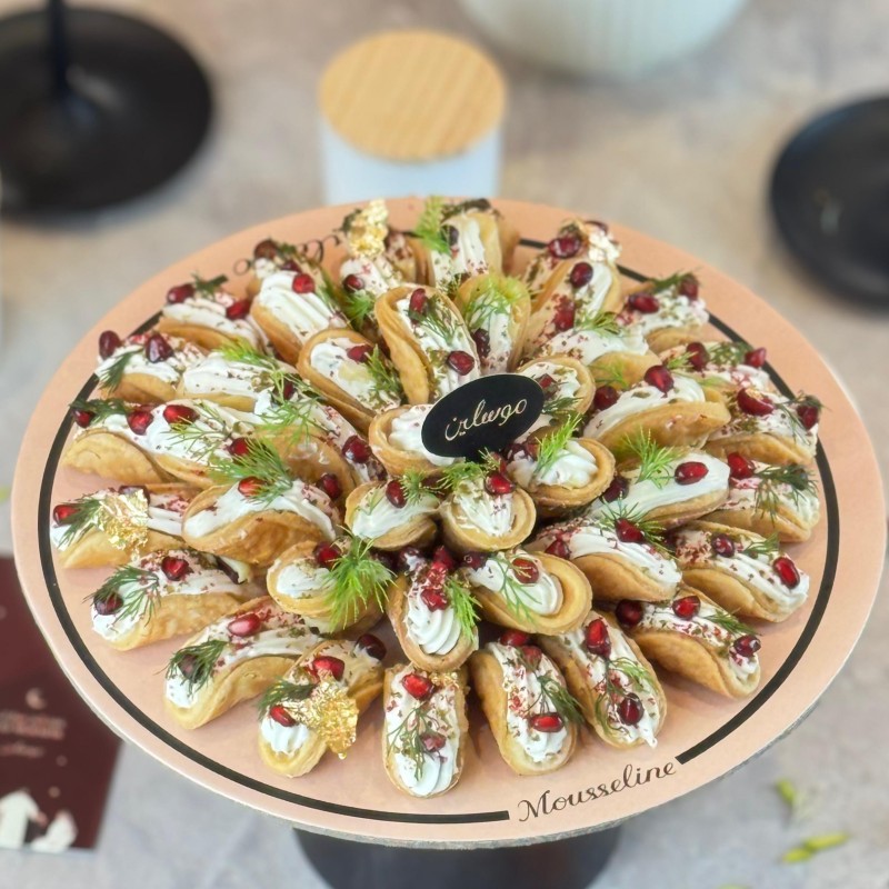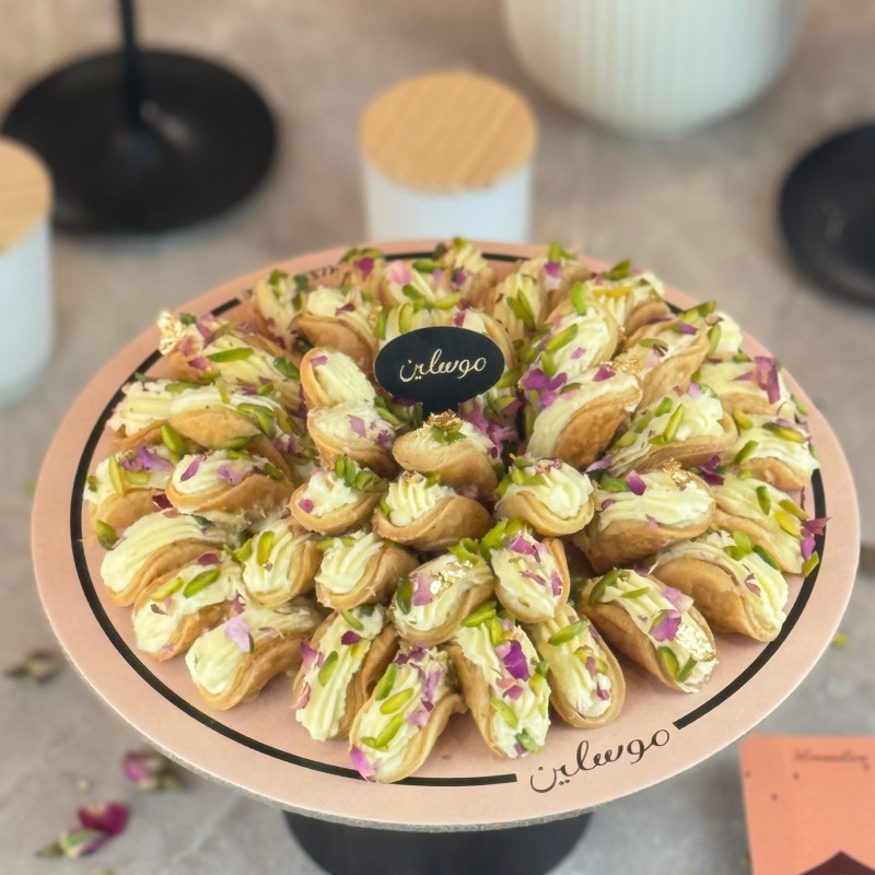 ٤٥ ميني حبة -ميلفيه تاكو مقرمشة محشوة بالكريمة الخاصة ومزينة بالورد والفستق