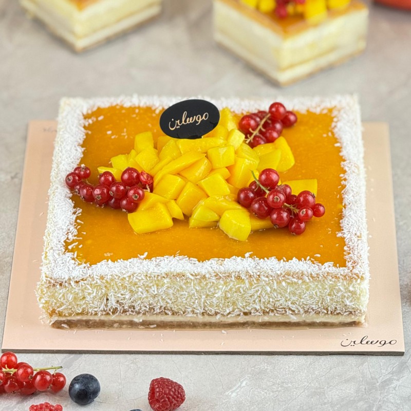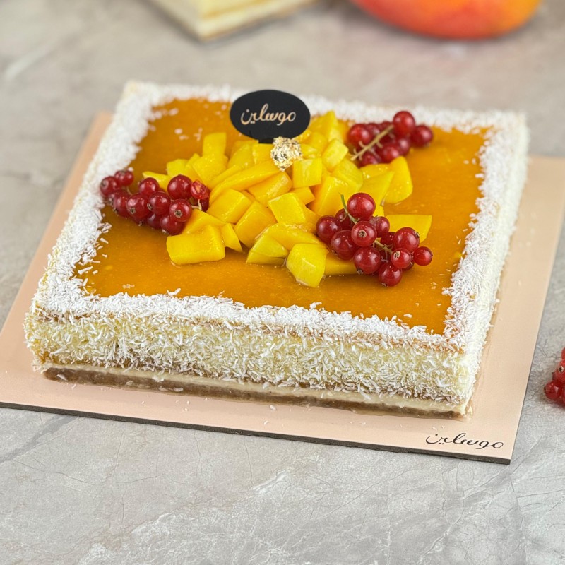 يكفي من ثمانية إلى عشرة أشخاص – مزيج شهي من طبقة البسكويت وكيك الفانيلا الإسفنجي، غني بصوص المانغو ومغطى بطبقة غنية من جوز الهند ومزيّن بالمانغو والتوت الأحمر الطازج
