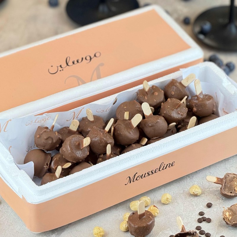 ٢٢ ميني بايتس مكس من آيس كريم الشوكولاتة والكراميل مع البندق، مغطاة بالشوكولاتة اللذيذة