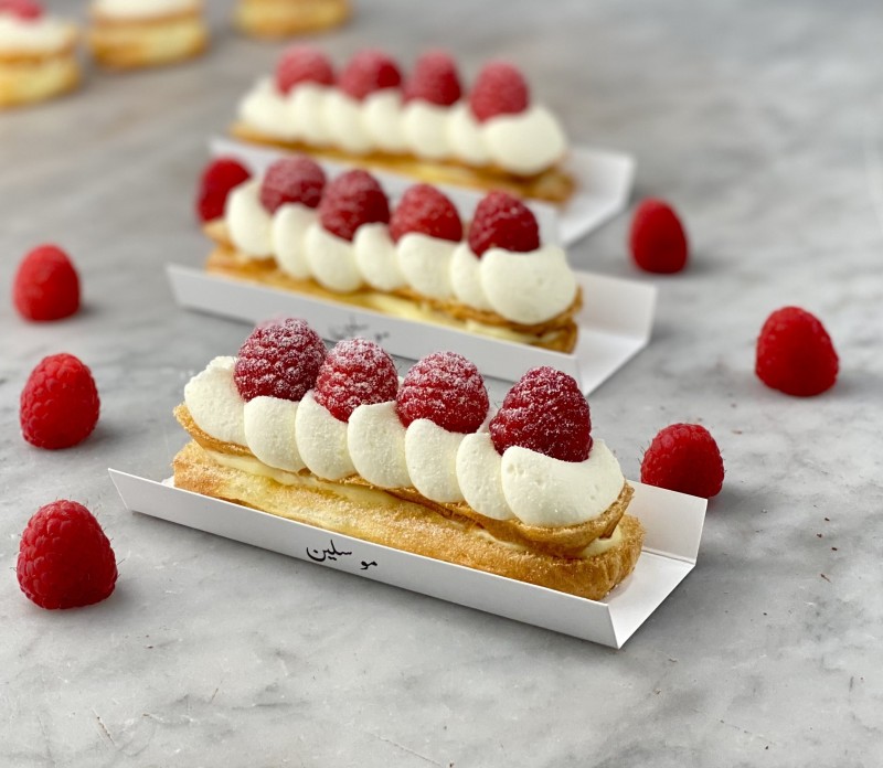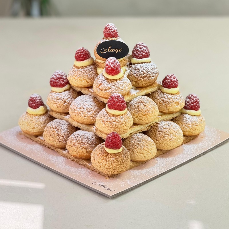 ٣٠ حبة بروفترول محشوة بكاسترد الفانيلا، فوق طبقات من الميلفيه، ومزينة بالسكر الناعم وتوت العليق الطازج.