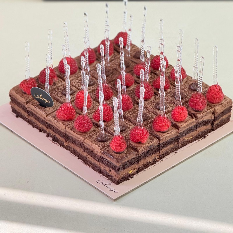 خمسة وعشرون ميني بايتس من سبونج التشوكلت كيك مع كريمة خاصة، مغطاة بجناش الشوكولاتة الغني ومزينة بحبات من توت العليق الطازج