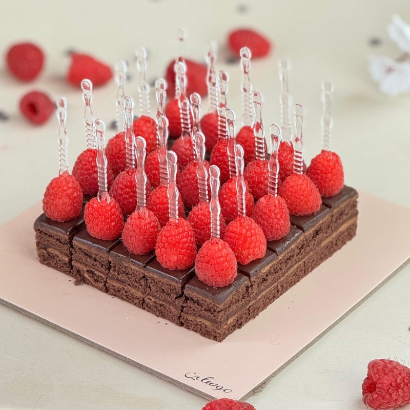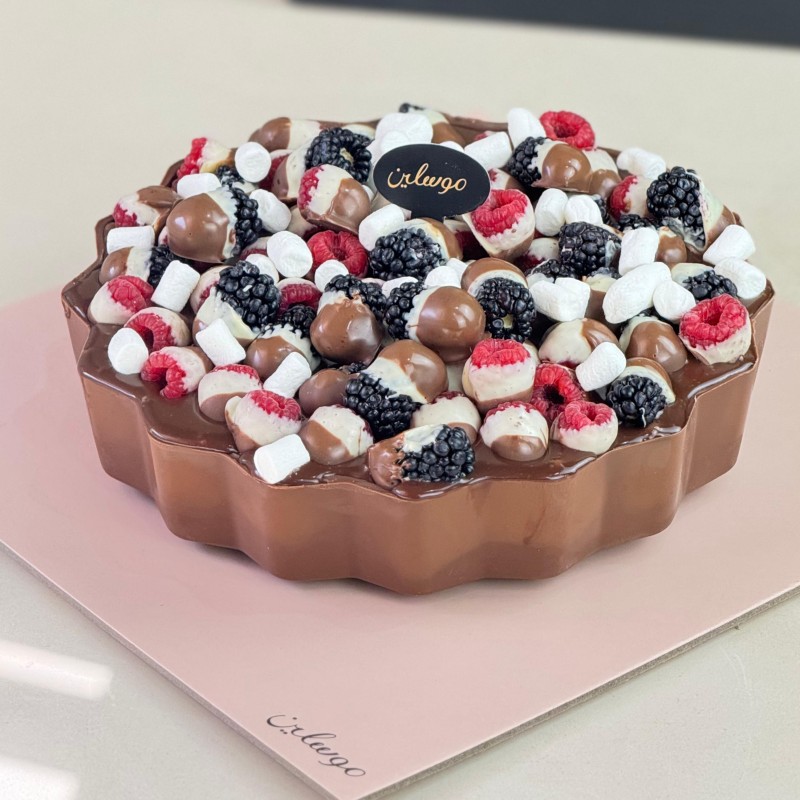حبة عدد 1 - 8 سم-كيكة شوكولاتة مع صوص التوت مغطاة بشوكولاتة الحليب والبندق مزينة بتوت العليق