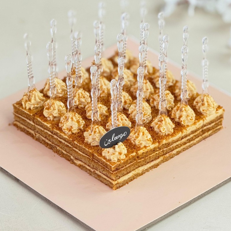 خمسة وعشرون ميني بايتس من سبونج كيك العسل الغني مع كريمة العسل الخاصة ومغطاة بفتات العسل