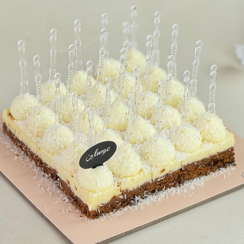 خمسة وعشرون ميني بايتس من كيكة الجزر بالقرفة والجوز مغطاة بكريمة خاصة ومزينة بجوز الهند لمذاق رائع ولذيذ