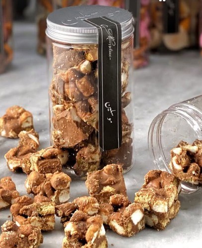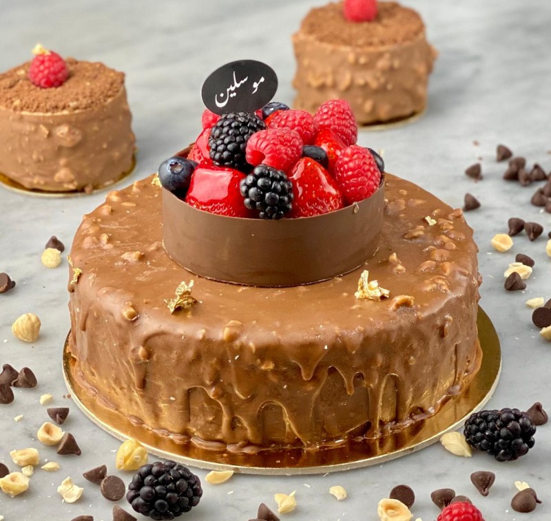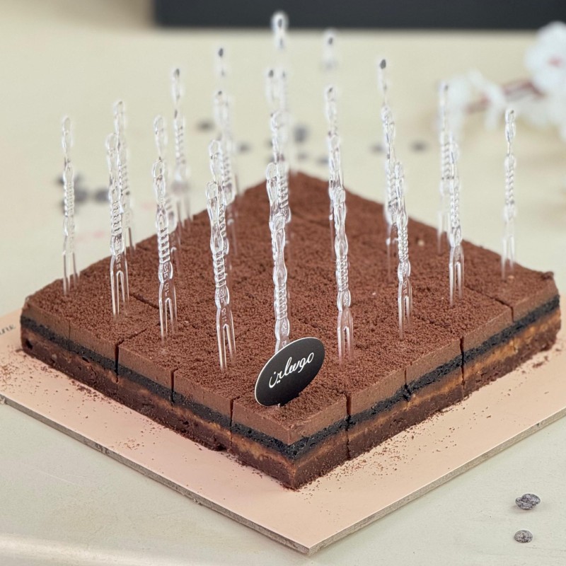 يكفي من ستة إلى ثمانية أشخاص – كيك شوكولاتة إسفنجي محشو بكريمة تشيز والشوكولاتة وصوص الكراميل، مغطى بالكرانشي كريسبي، ويقدم مع صوص الشوكولاتة