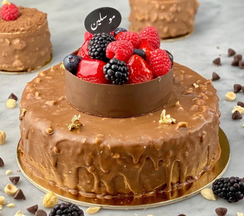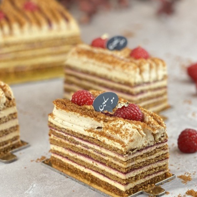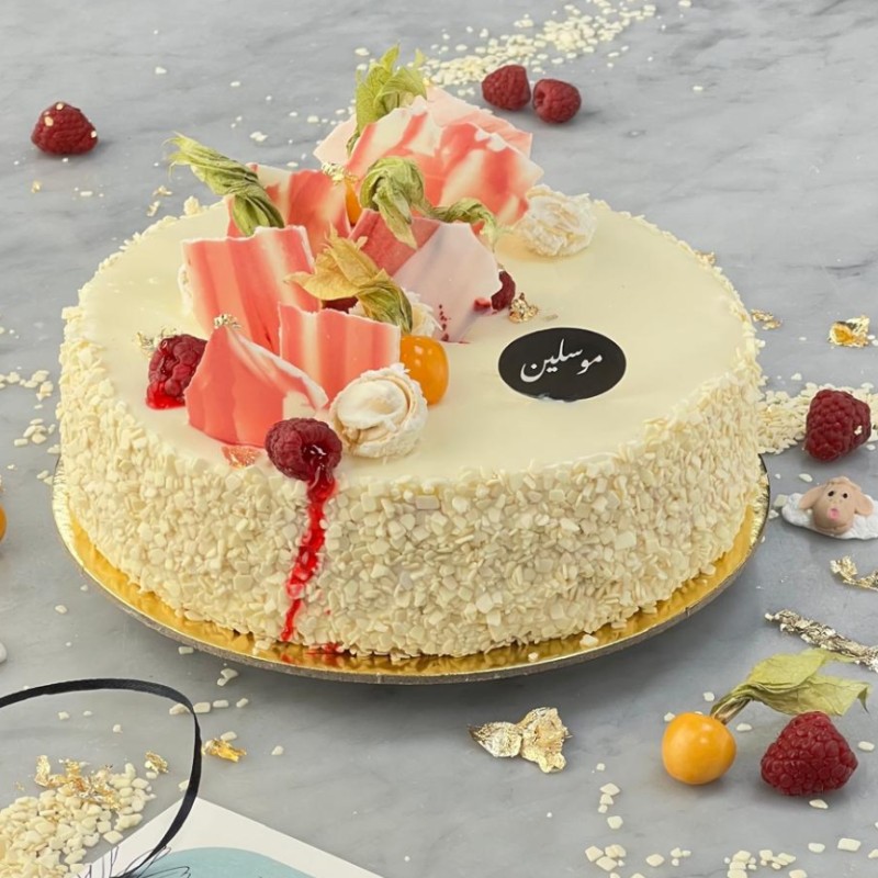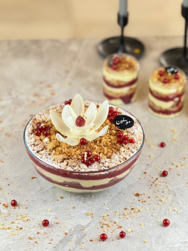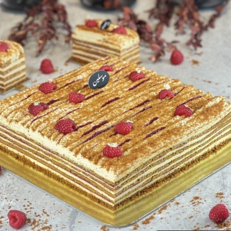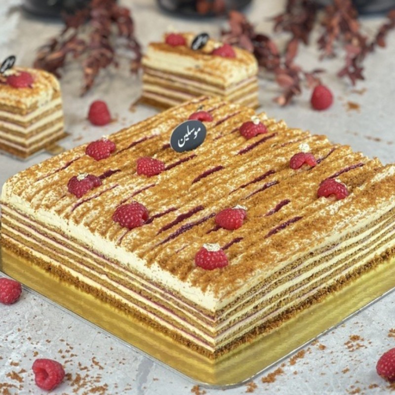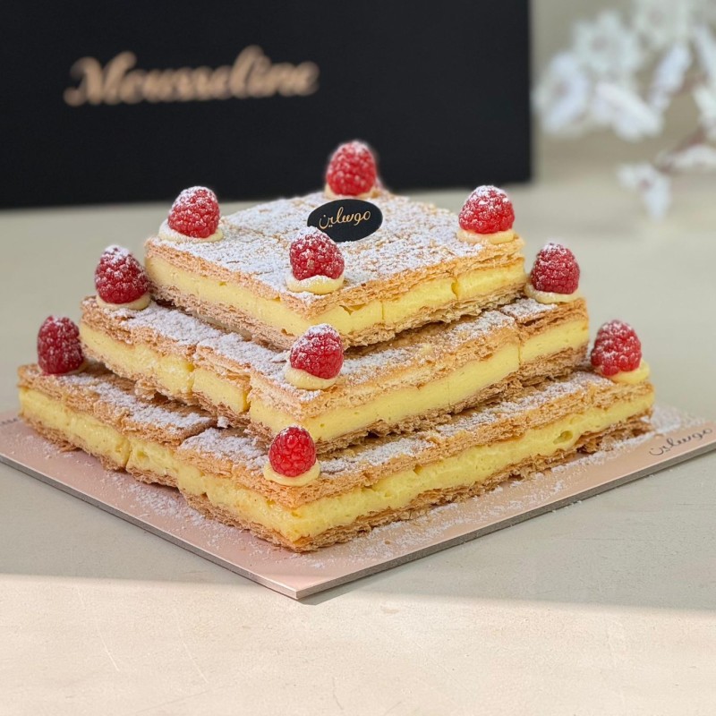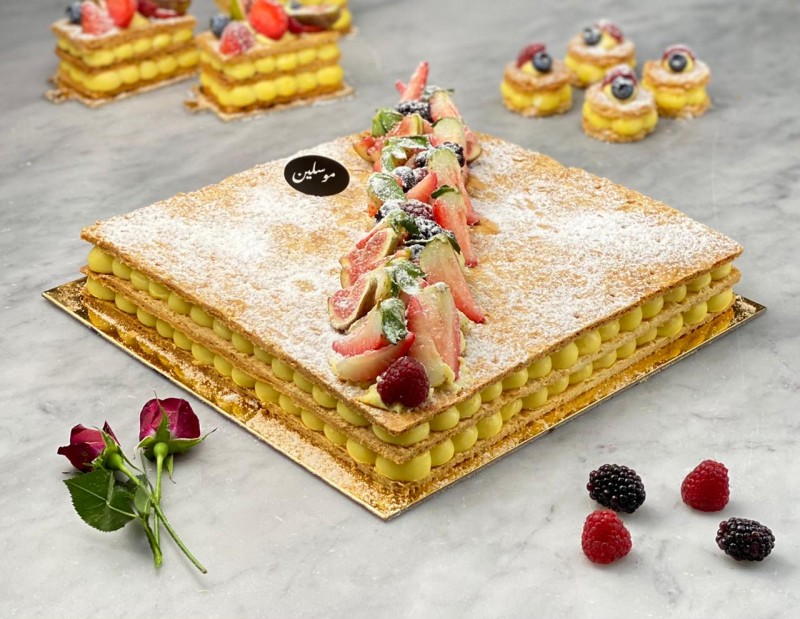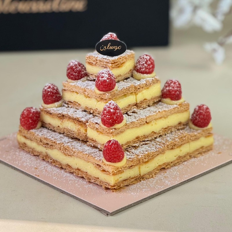 6-8 أشخاص-طبقات من الميلفيه والشوكولاتة البيضاء وهريس التوت و كريمة الفانيليا الخاصة مع اللوز والكشمش الأحمر