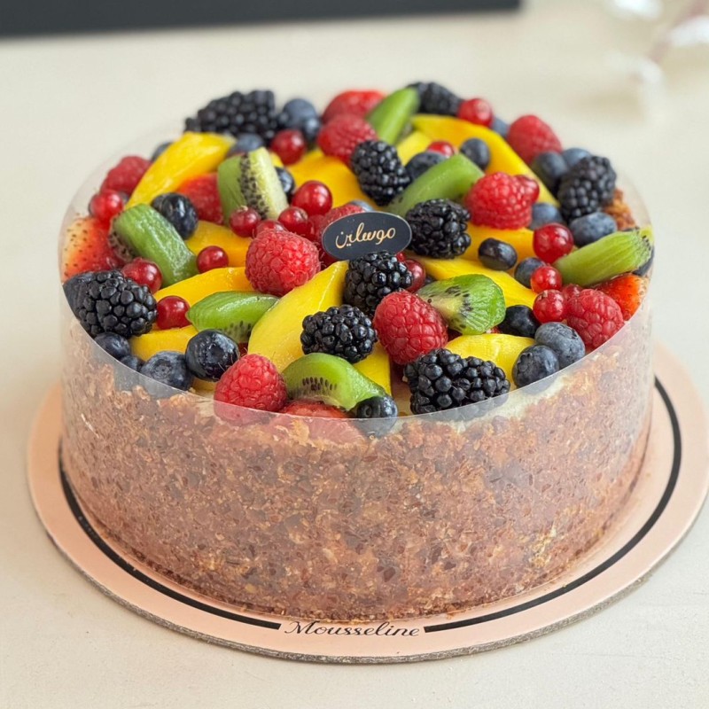 8-10 أشخاص - 20 سم-كيكة خفيفة وكريمية محشوة بصوص توت العليق ومزينة بالفراولة وتشكيلة متنوعة من التوت والكيوي الطازجة واللوز المقرمش.