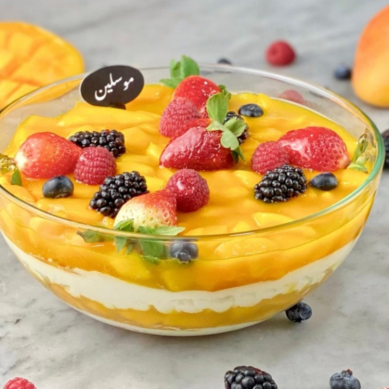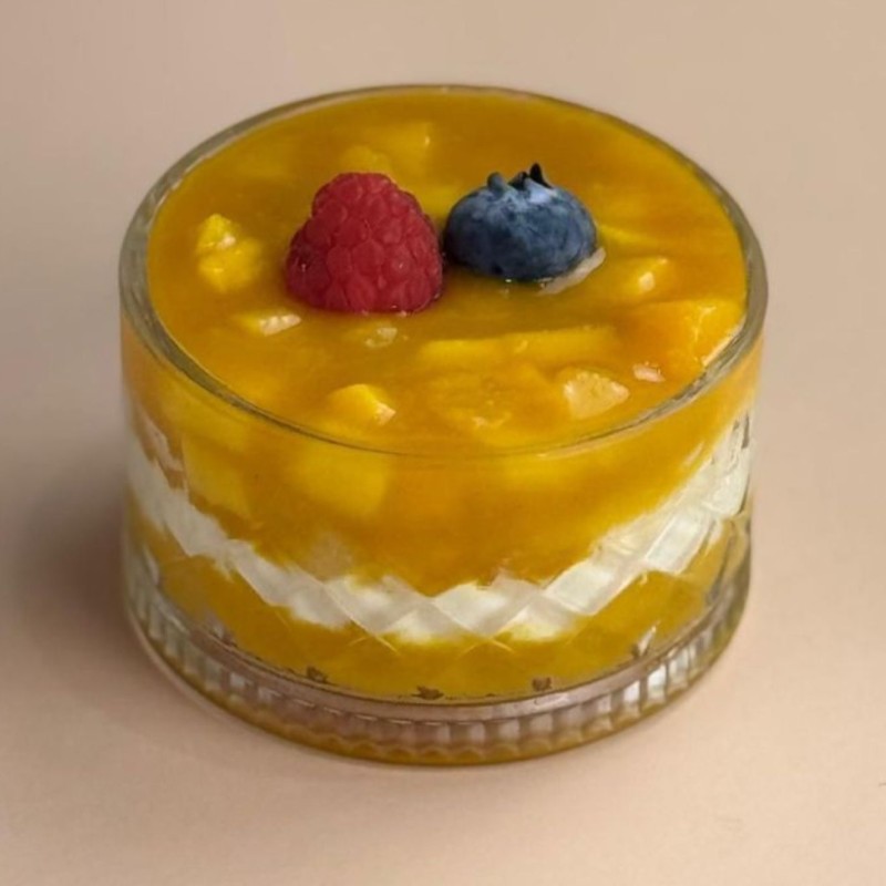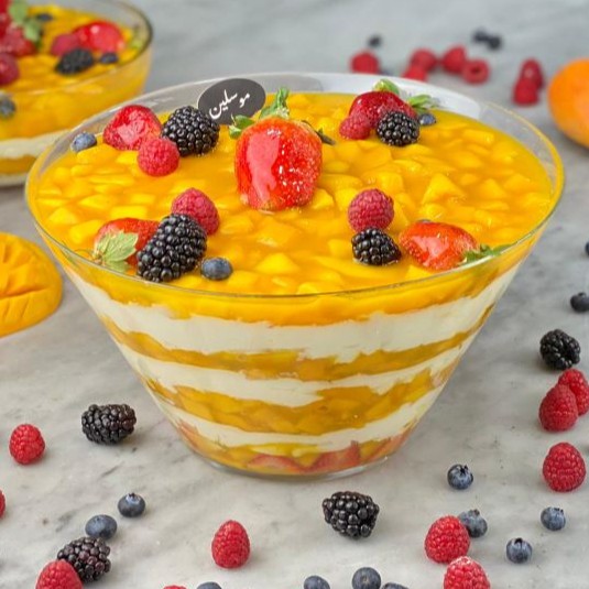 حبة عدد 1 - شخص-مزيج من عصير وقطع المانجو الطازجة مع طبقات من كيكة الفانيلا والكريمة الخاصة والمزينة بتوت العليق