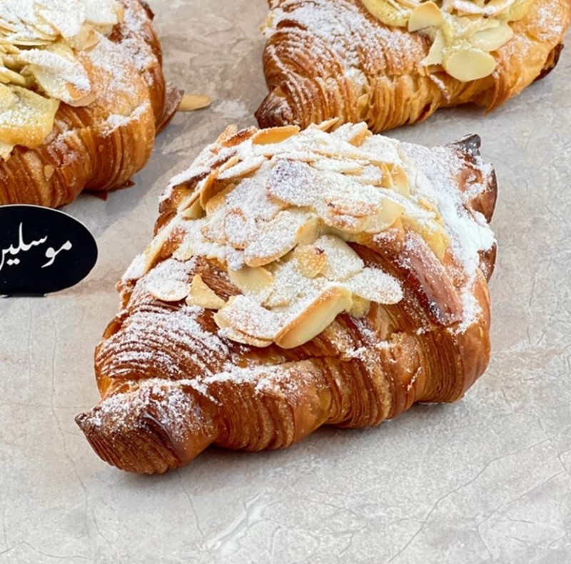 كرواسون اللوز الطازج محشو بكريمة اللوز ومغطى بشرائح اللوز المقرمشة والسكر الناعم