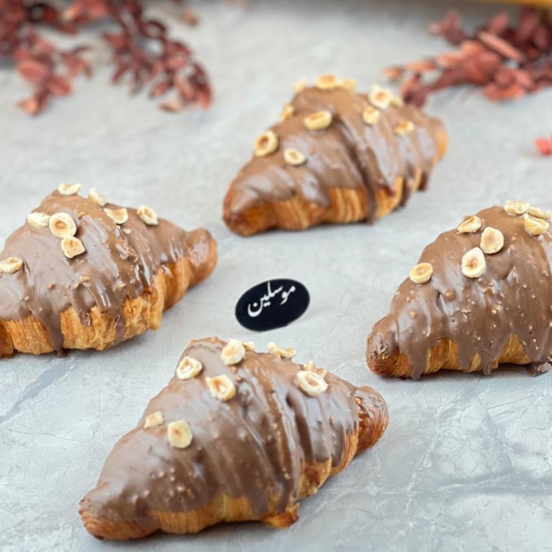 كرواسون الشوكولاتة الطازج مع حشوة الشوكولاتة الغنية المغطاة بالبندق