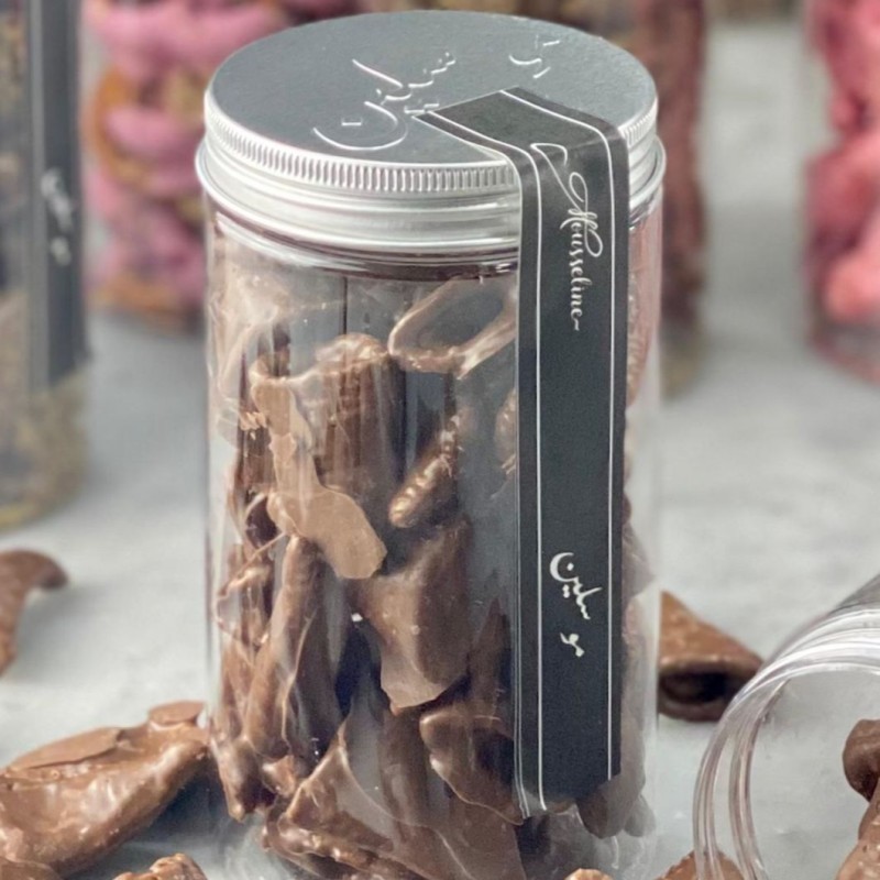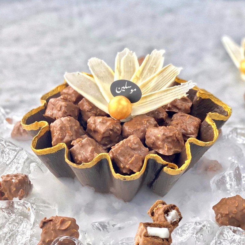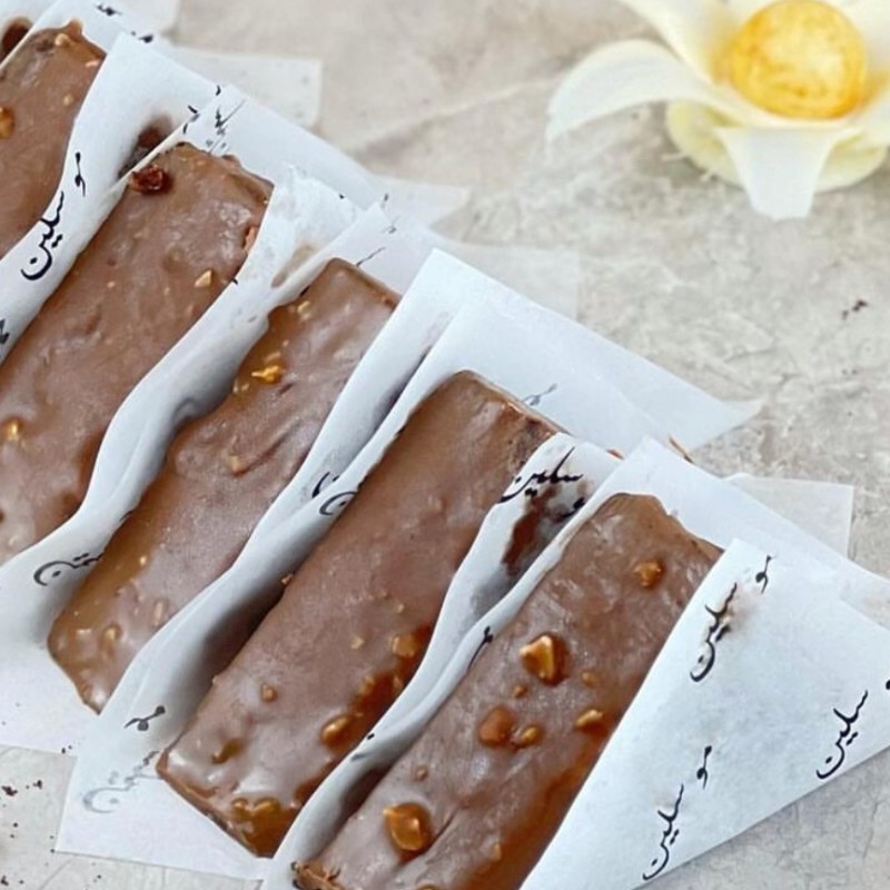 حبة عدد 1 - 8 سم-طبقات من الشوكولاتة الداكنة وشوكولاتة الحليب مع حشوة كريمة الفانيليا والكراميل مغطاة بالبندق والشوكولا