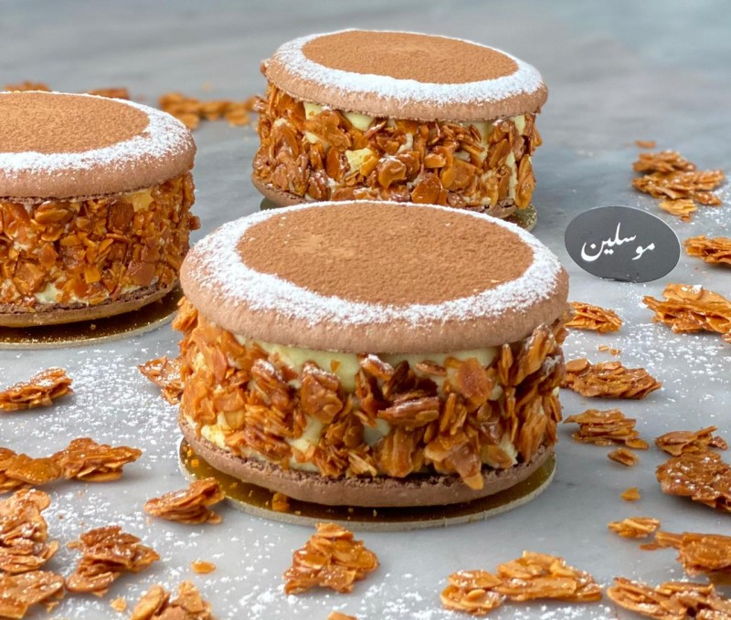 حبة عدد 1 - 8 سم-ماكرون فاخر بالشوكولاتة البراونز محشو بكريمة مميزة ومغطى بشرائح لوز مكرمل مع الكاكاو والسكر الناعم