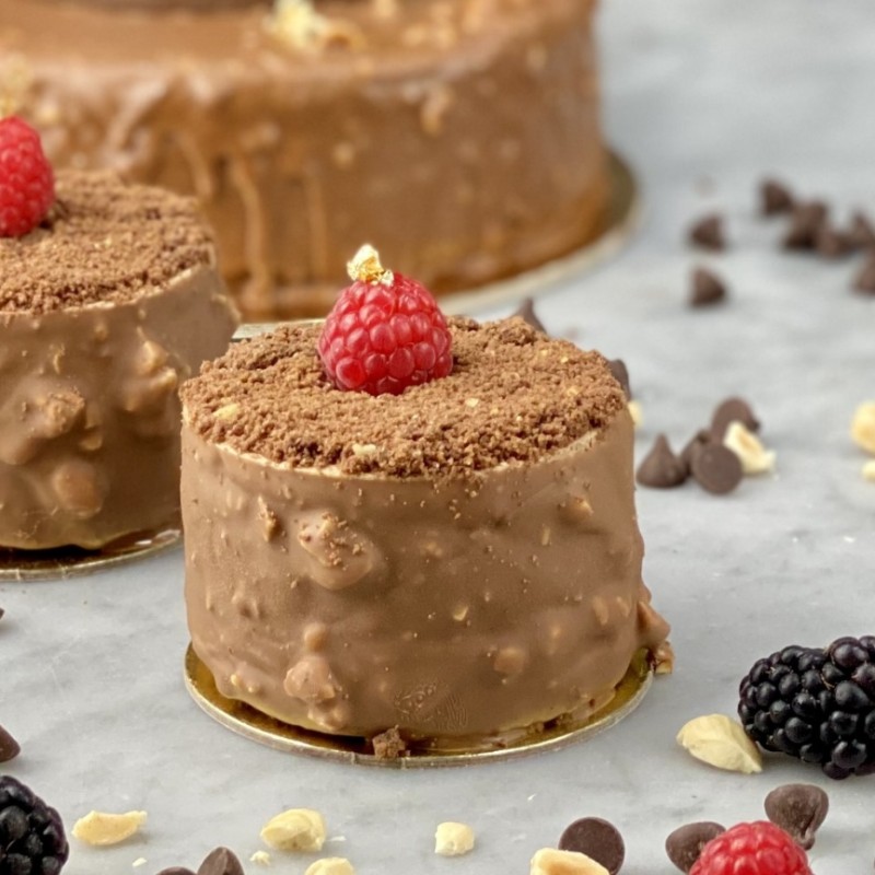 6-8 أشخاص - 20 سم-كيكة شوكولاتة مع الفيريرو شوكلت والكريم تشيز مغطاة بشوكولاتة فيريرو روشير ومزينة بالبندق المقرمش