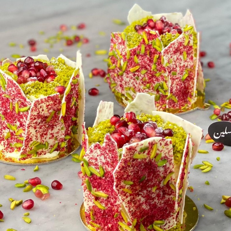 حبة عدد 1 - 8 سم-كيكة غنية بطبقات من كيك الفستق وهريس الرمان مغطاة بكريمة الفروستينغ ومزينة بالفستق وحبات الرمان الطازجة