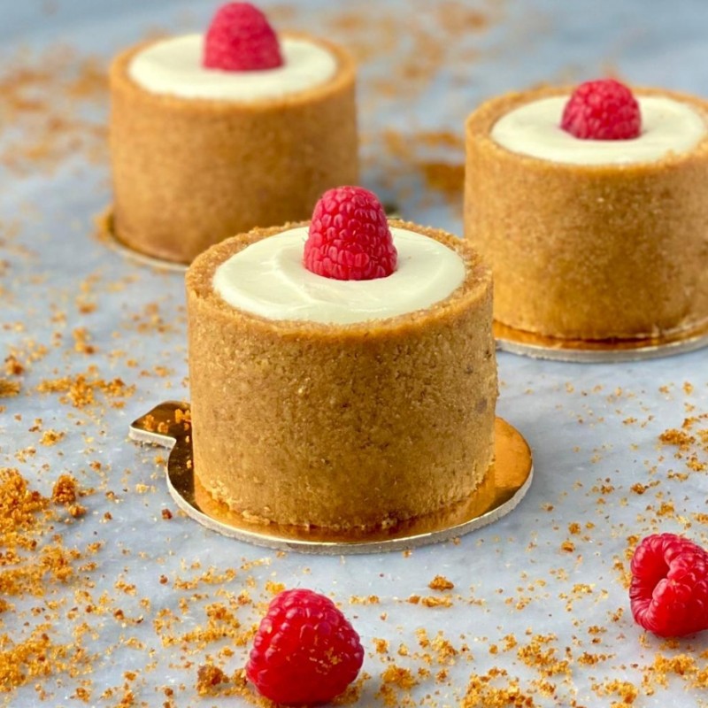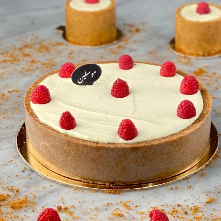 حبة عدد 1 - 8 سم-تشيز كيك غني بكريمة الجبن الفانيلا الخاصة مغطاة بفتات البسكويت والجوز وتوت العليق الطازج