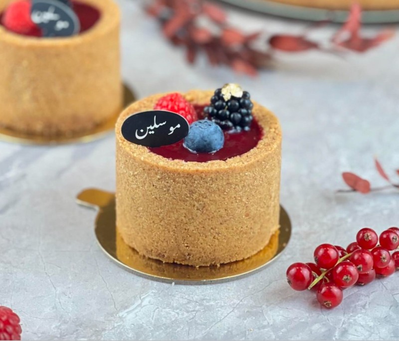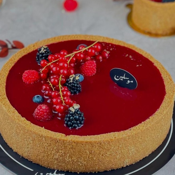 حبة عدد 1 - 8 سم-تشيز كيك مع صوص التوت الخاص ومزين بأنواع من التوت الطازج ومغطى بالجوز وفتات البسكويت المقرمشة