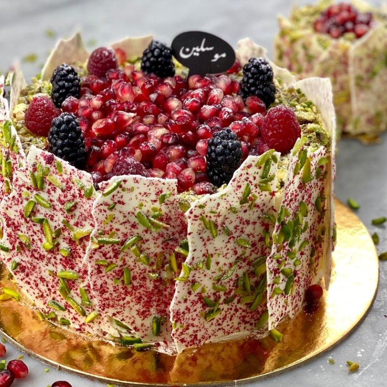 8-10 أشخاص - 20 سم- كيكة غنية بطبقات من كيك الفستق وهريس الرمان مغطاة بكريمة الفروستينغ ومزينة بالفستق وحبات الرمان والفواكه الطازج